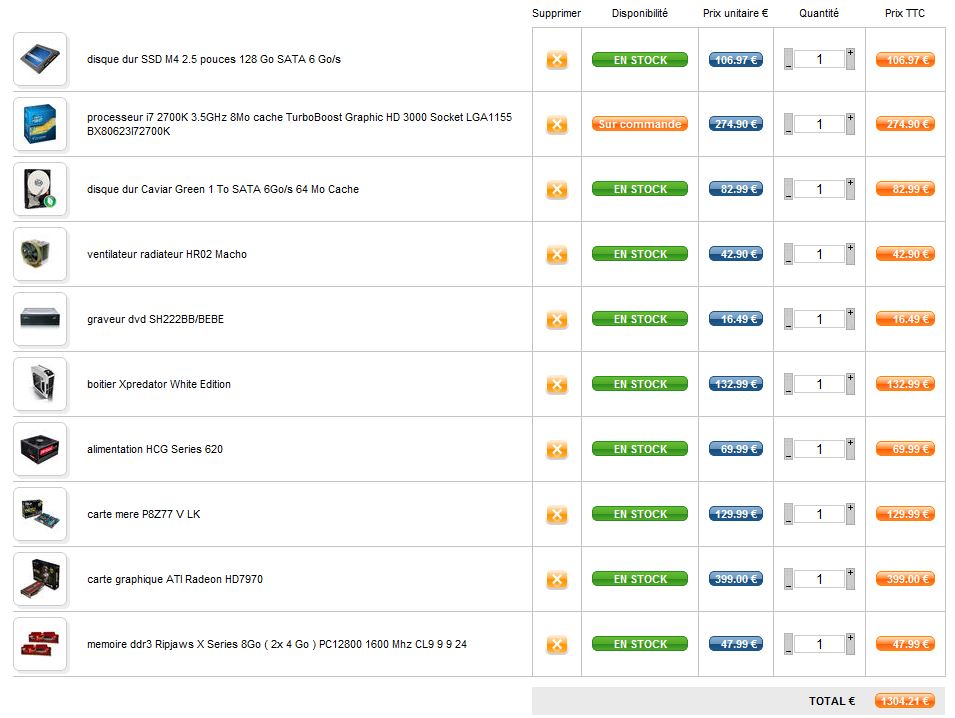 Intel Core i7 3770 299,99 € je pense qu'un i7 2600k serait mieux vu le retour moyen sur les ivy. Le i7 plus performant pour l'encoding malgrès le risque que le HT soit mal géré dans les jeux, pourquoi pas.