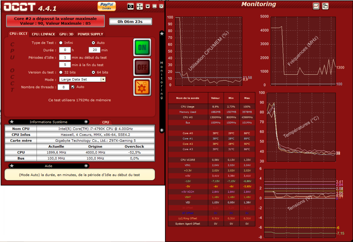 je crois quil ya un srx probleme le stresstest sest arrrete a 43min affichant un msg en rouge qui dit que core#2 a depasse la valeure maxiamle 90, valeur maximale 85