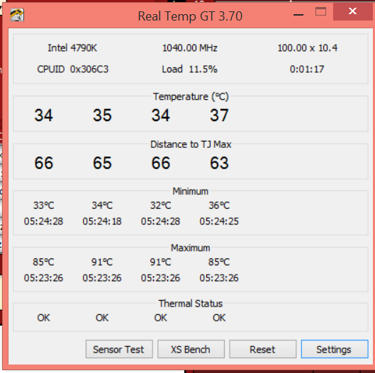 mon nouveau i7-4790k avec 16Go de ram et une gigabyte z97x-gaming 5 place sous un ventirad cooler master 412 slim est tempere a 38°C sans aucun stresse mais il atteint les 82°C load a 100%