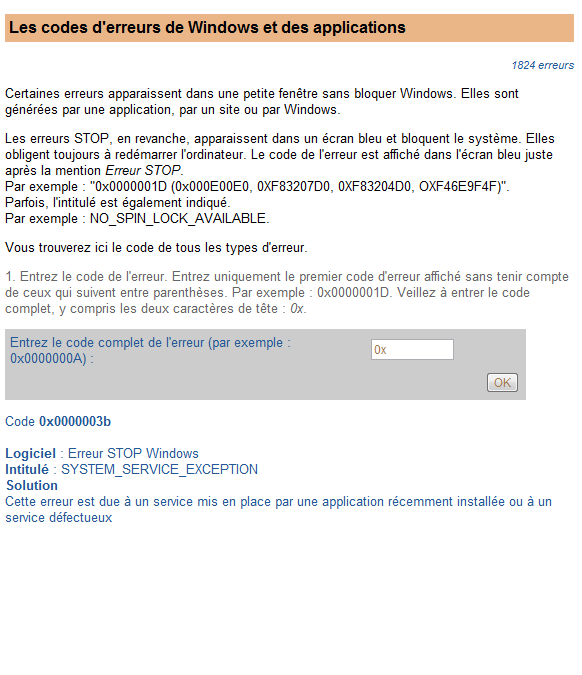 Nous démontre, en entrant ce code d'erreur 0x0000003b