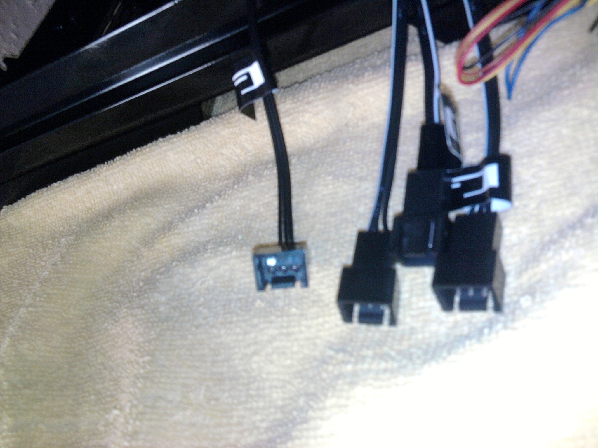 Les câbles que tu prends en photo sont des adaptateurs pour ventilateurs. C'est ce qui te permet de brancher un ventilateur à fiche 3 pins sur une prise d'alimentation molex.