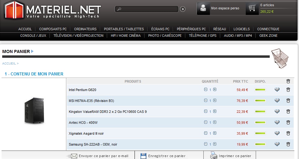 Parce que si tu prends mon panier mat.net, que tu rajoutes 80 euros pour le DD et 20 euros pour l'ensemble clavier/souris, il revient moins cher que ce que tu viens de faire sur ldlc.