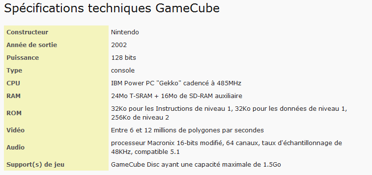 Voici la fiche technique de la Game cube