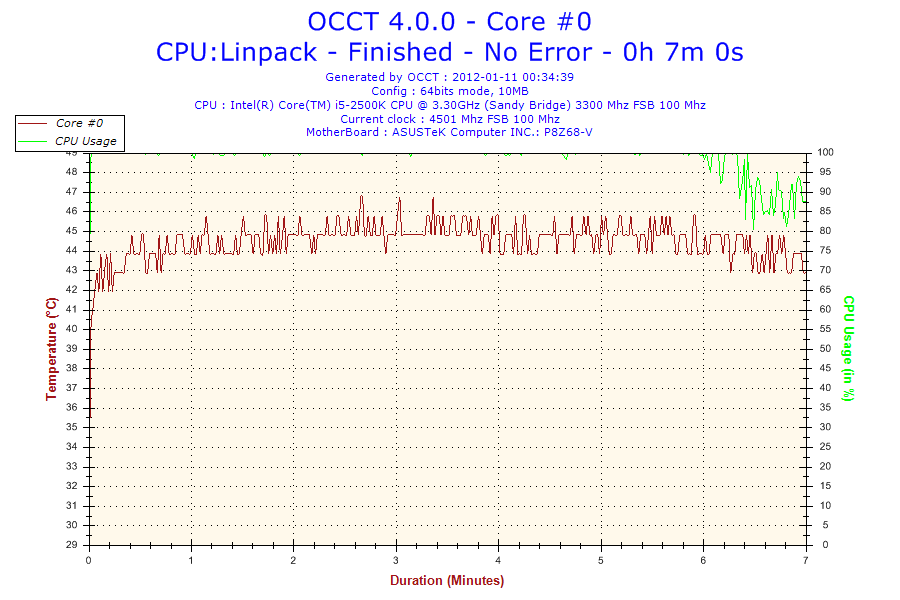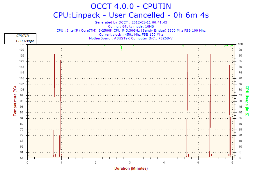CPUTIN est un bug d'interprétation des infos données par les sondes. Voici par exemple un test OCCT de mon proc à 4.5 avec LINPAK, tu verras des températures énormes sur le relevé CPUTIN (plus de 125°) alors que le core ne dépasse jamais les 46°.