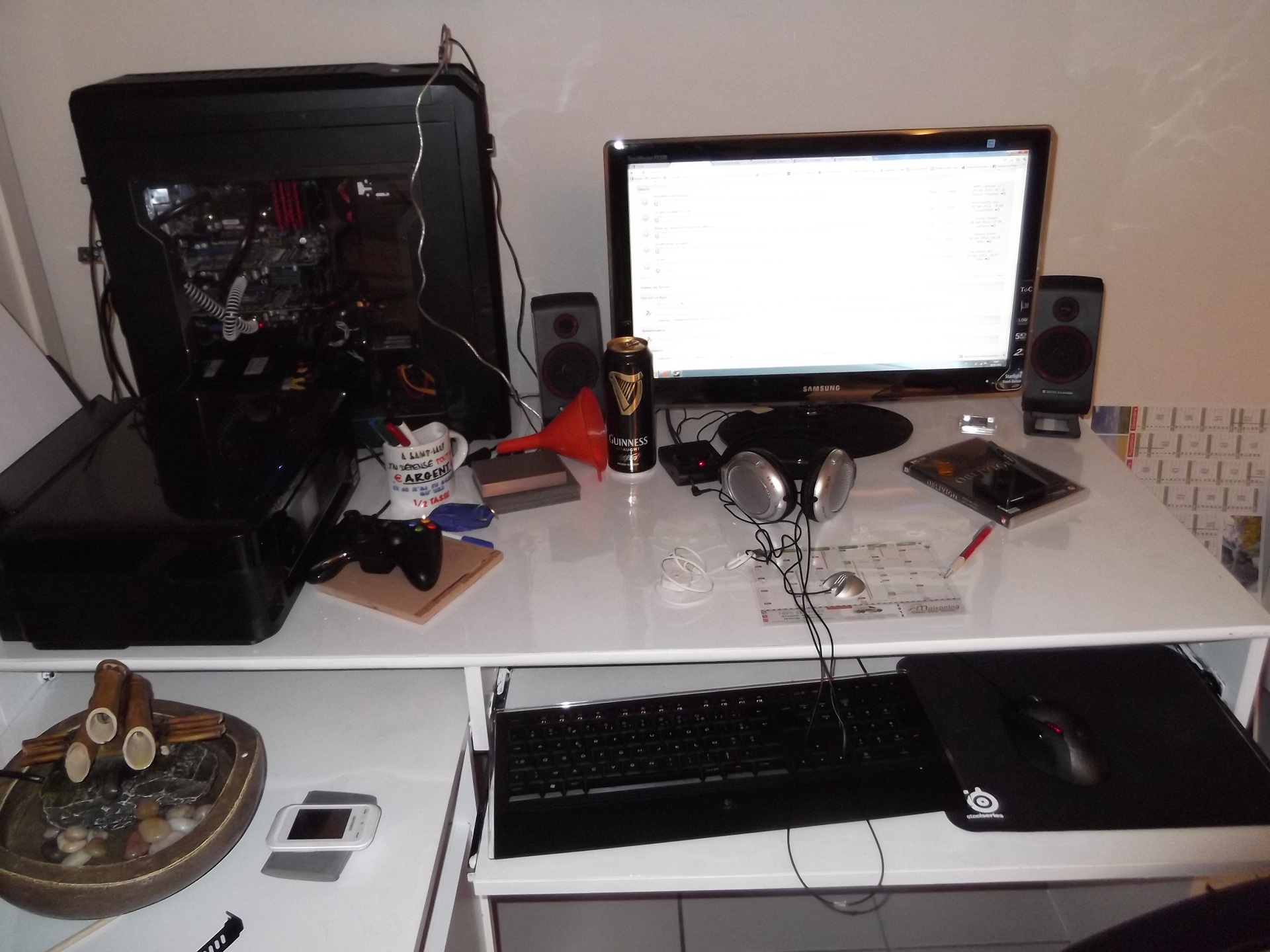 Voici donc le miens avec son jolis bordel , pour se qui se trouve derrière le bureau c'est top secret mais y'a du monde