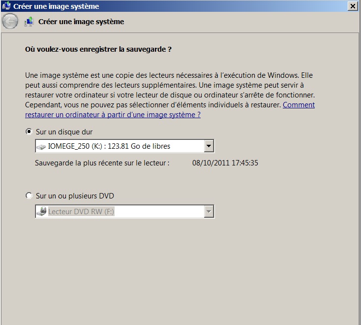 Je voudrais créer une image système sur un disque dur réseau or la page qui permet de choisir la destination ne présente que les 2 premières options (voir copie d'écran) alors que sur des copies d'écran vues sur les forums il existe une 3ème option : " partage réseau".