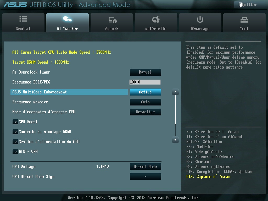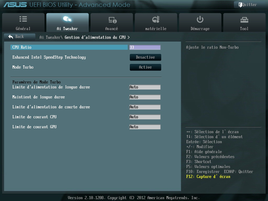 Logiquement c'est ce que tu décris qui règlerait le problème.totoche a écrit :Sur le manuel de la P8Z77 V LX il parle au chapitre 3.8 que le turbo ratio et ratio mode a une option pour synchronisé le coéficient multiplicateur c'est peut être cette option qui bloque le faite de pouvoir jouer sur le coefficient multiplicateur tu doit pouvoir les désactiver t'en pense quoi NB91 regarde le manuel http://static.highspeedbackbone.net/pdf ... French.pdf c'est écrit By Per Core