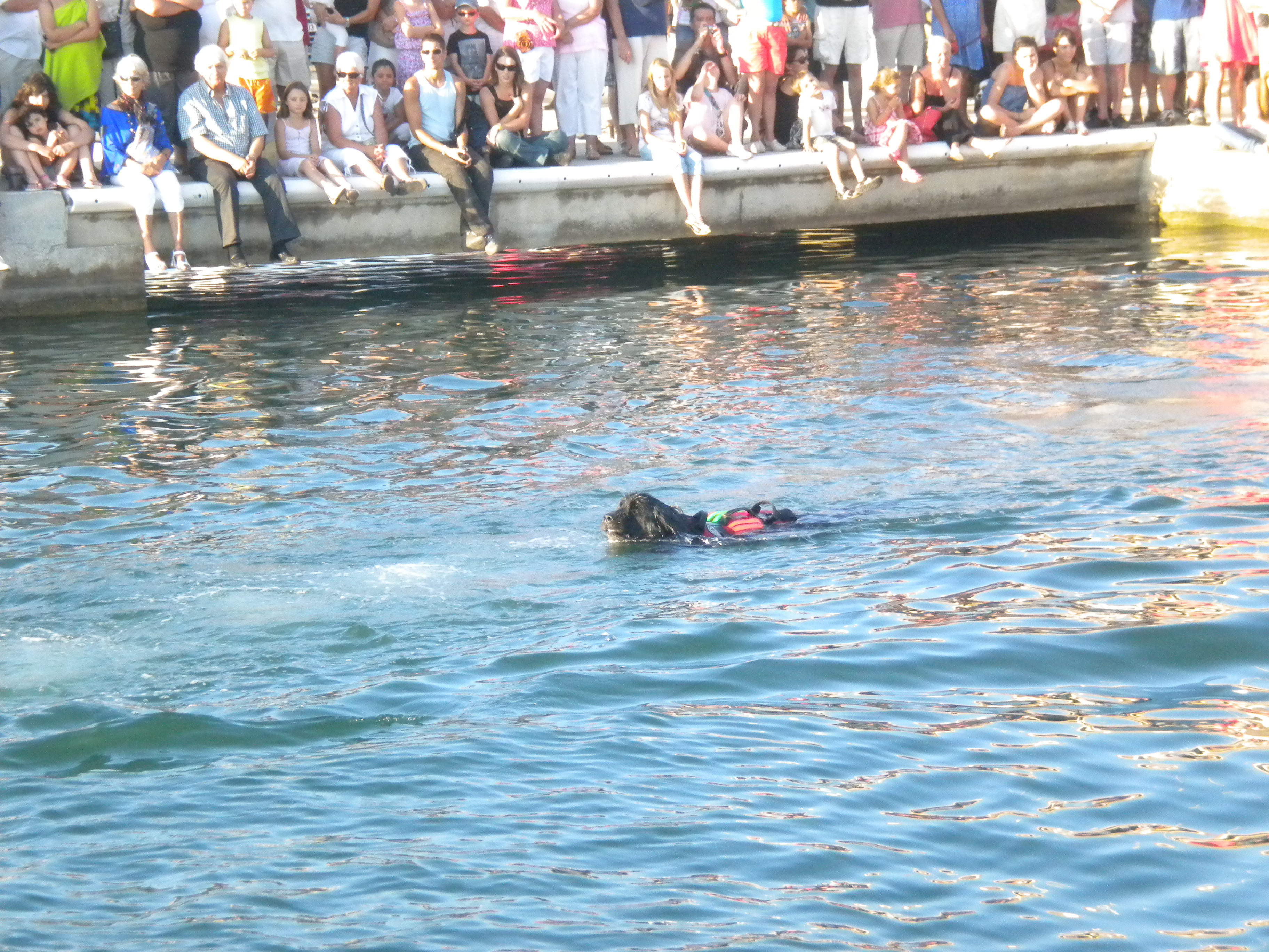 Un Terre Neuve en démonstration de sauvetage! La mére du chien en photo ci-dessous a sauvé trois personnes de la noyade sur Bandol, malheureusement une vague a projeté violemment la chienne sur un rocher lui brisant trois vertébres cervicales. Elle décéda quelques minutes aprés l'accident :cry: