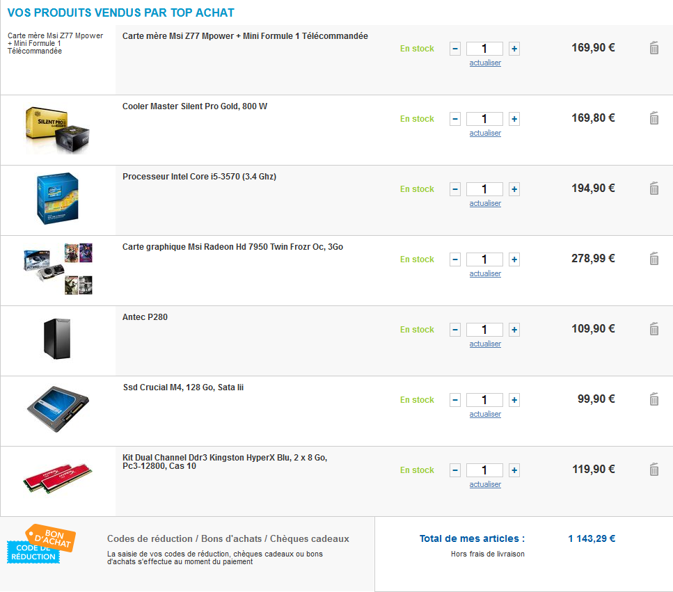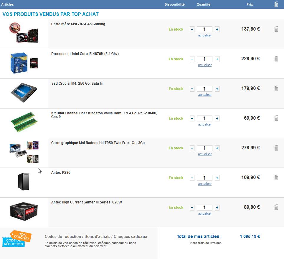 J'ai un budget max de 1000e (je sais la config dépasse un peu mais je compte sur des recherches un peu plus fines pour trouver le meilleur prix et puis sur les codes promos
