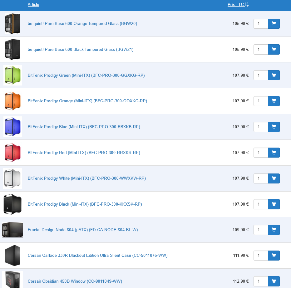 Ben le jour et la nuit pas forcément, sur ton site, le Corsair Carbide 275R est au même prix que le Fractal Design Define S pourtant le Fractal est beaucoup plus vieux mais sera surement plus silencieux, mieux fini, … que le 275R, qu'a pas un ans, ou tout juste ! Zalman, c'est loin de valoir le milieu de gamme pourtant il te vende des boitiers à 100€ :oops: idem pour le BitFenix Prodigy M vendu 100€, micro atx, plastique, poigné qui nique les mains, pour un pc "mobile" :oops: