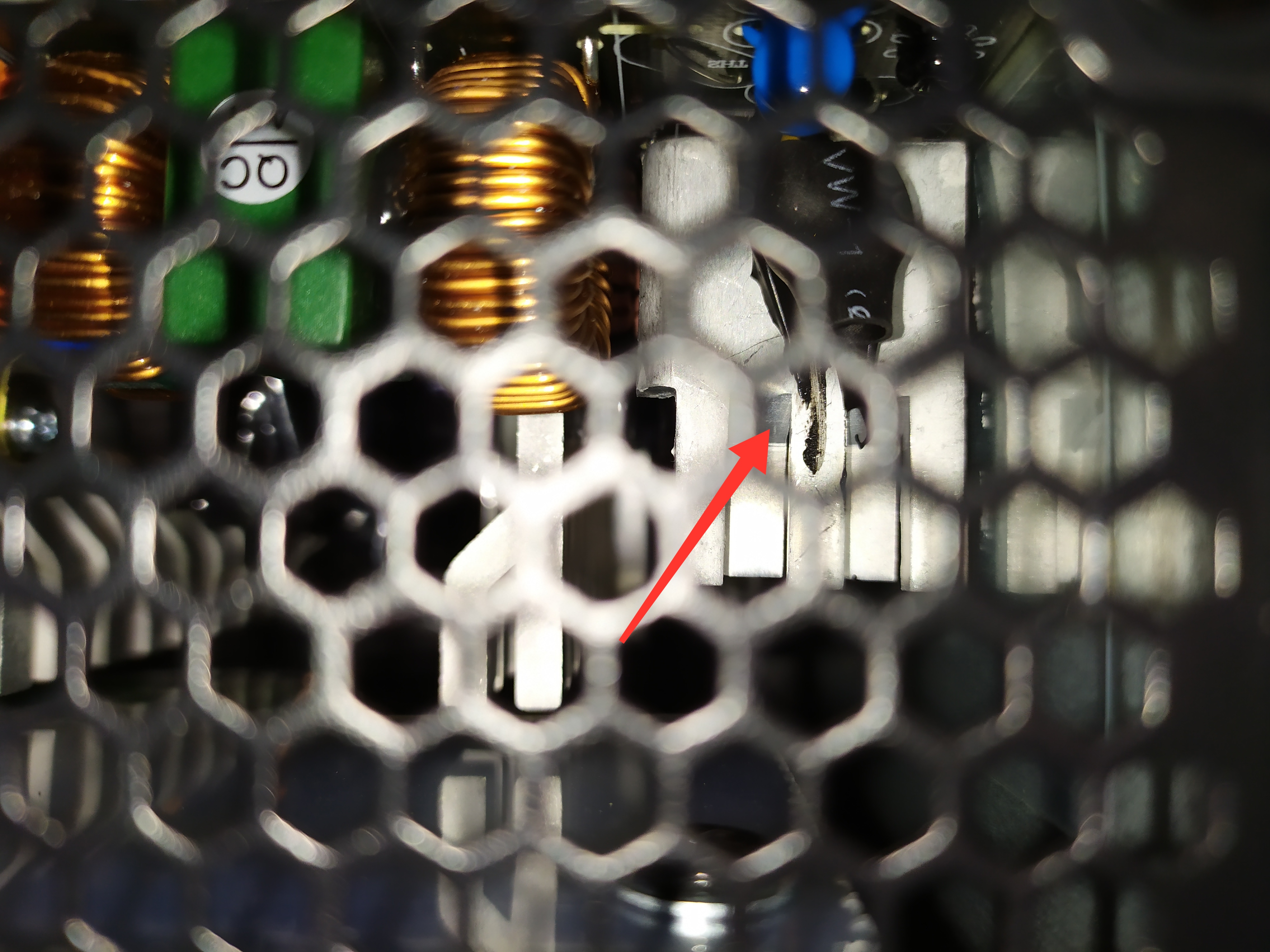 Je joint une photo de l'alimentation, où se trouve la flèche rouge il y a une trace noir je ne sais pas si quelque chose à fondu ou non et si cela été déjà comme ça avant.
