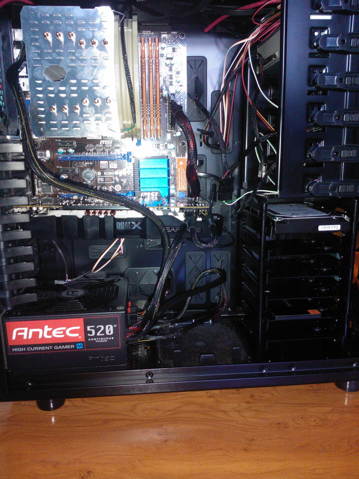 Voilà, pour l'instant ça a l'air de marcher après quelques péripéties avec le ventirad qui est pas si facile que ça à mettre en place (erreur de débutant la prochaine fois je le fixe avant de fixer la carte mère au boîtier xD).