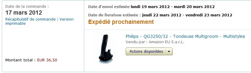 J'ai passé commande chez amazone 5 en quantité restante je pence pas qu'il soit tous parti avant lundi livraison en 3 jours ouvré je pence l'avoir avant jeudi au plus tard