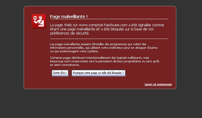 Depuis ce matin j'ai un message qui me met que comptoire du hardware est une page malveillante et j'ai beau lui dire que ce n'est pas un site malveillant, je n'ai pas moyen de l'afficher...