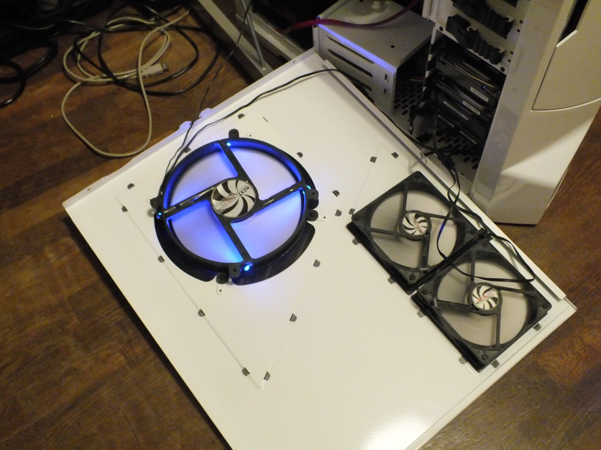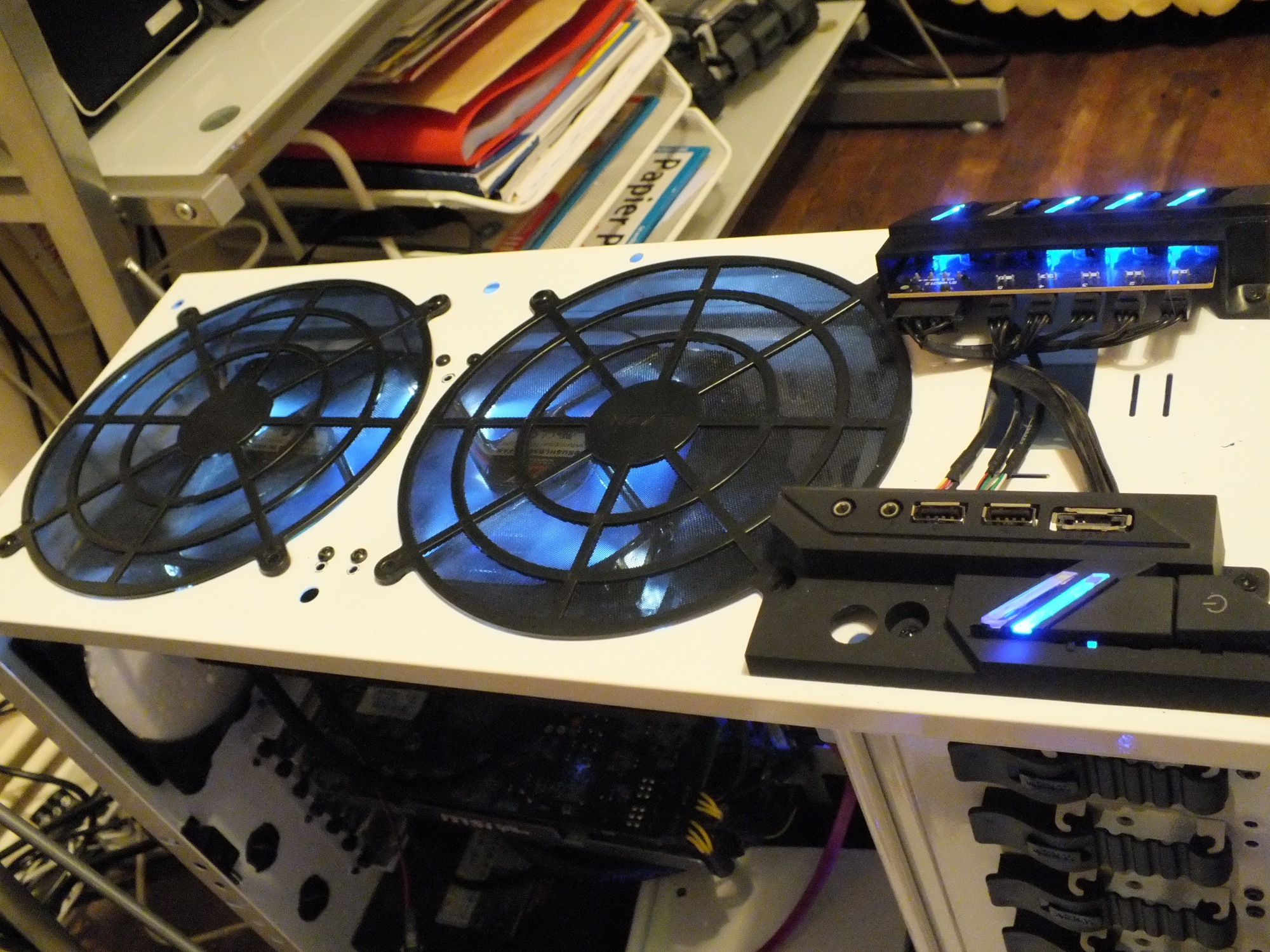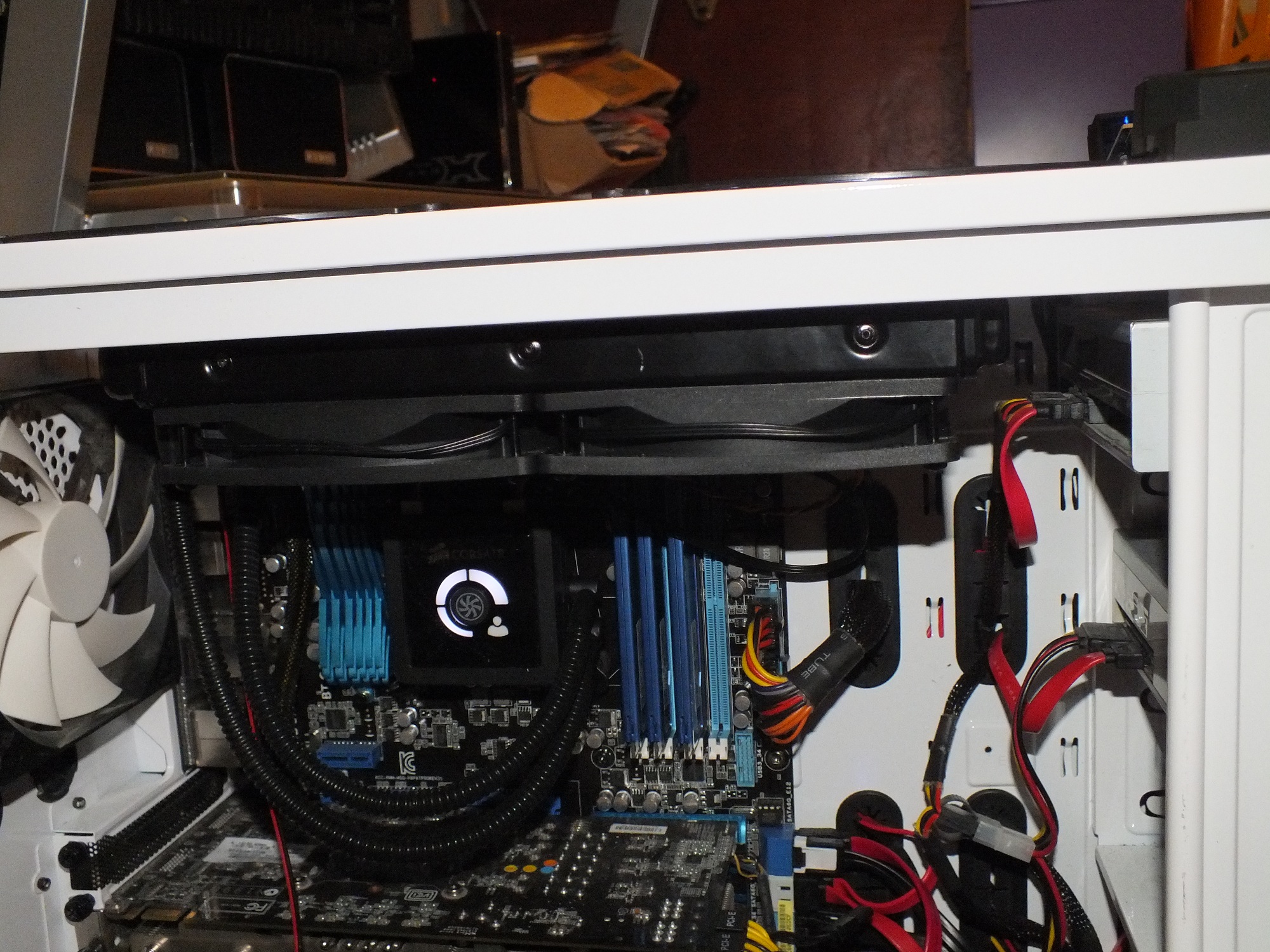 j ai enlevè le ventilo bleu du haut de la tour , pour le mettre sur la porte et la miracle sa ferme . j ai du changer mes barettes de ram , a cause des dissipateurs de mes corsair vengeance. j ai mis a la place des kingston 1600 mhz 3x4 go.