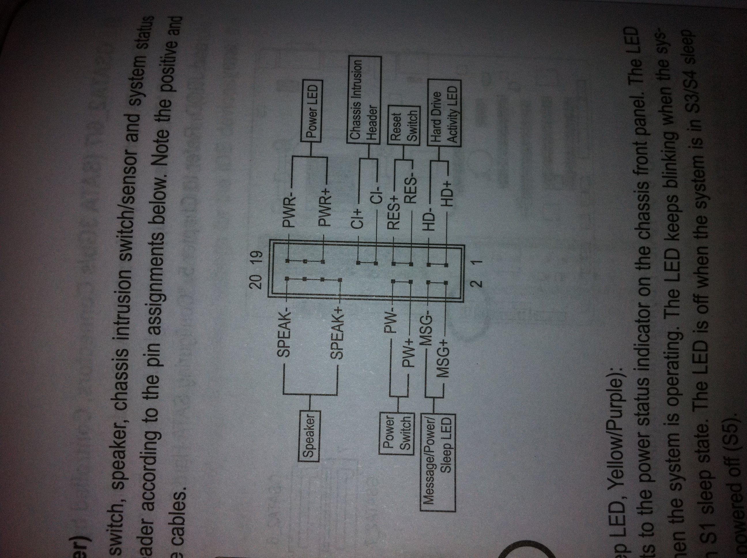 j'ai brancher speaker sur speak, reset sur res, HDD led sur HD, power SW sur PW il reste les deux petit -P led et +P led