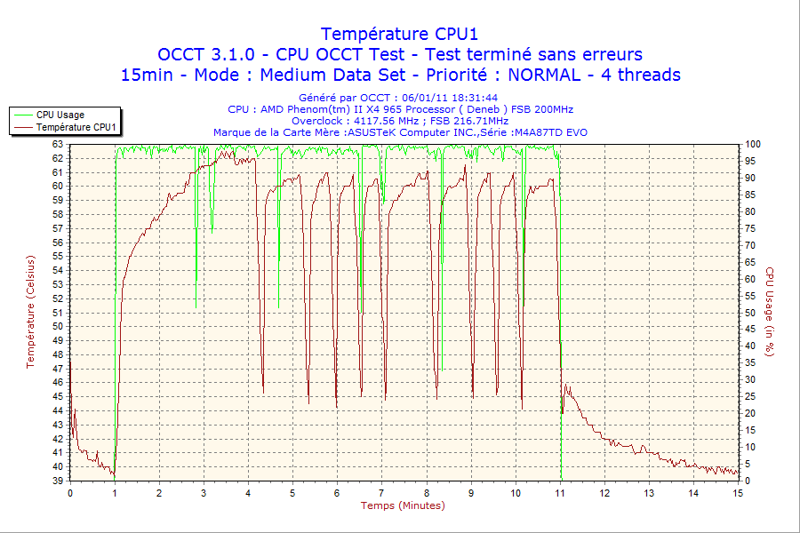 Voilà c'est fait, j'ai overclocker mon processeur AMD Phenom II X4 965 à 4.0 Ghz (4.027 exactement), tout est stable et les températures avec un ventirad Noctua et un ventilateur nzxt à l'arriere(le second ne ventile que le disque dur a cause des câblages et les deux autres sont désactiver car trop brouillant) sont relativement bonne 55° à 100%, niveau sonore rien a signaler je ne vois pas la différence.