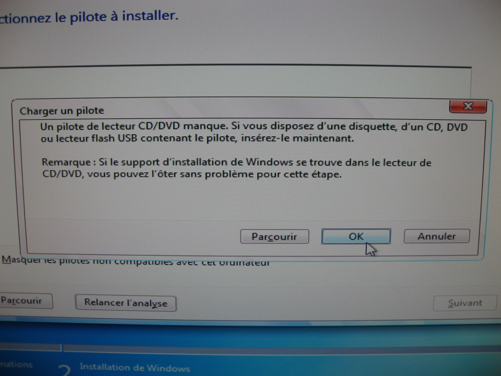 si tu as des périphériques externes, lecteur de carte ou autre, débranches les pour faire l'installation.