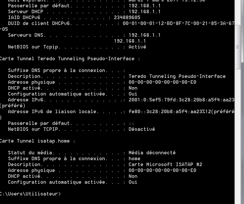 Serveurs DNS. . . . . . . . . . . . . : 192.168.1.1