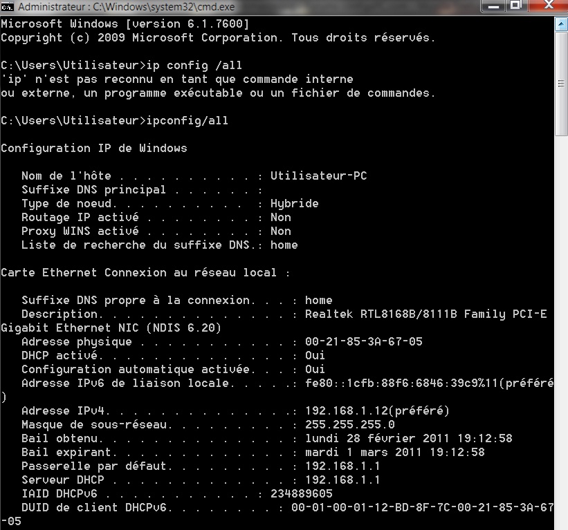 clic gauche sur demarrer--> executer --> taper cmd puis ip config /all dans la fenetre noir (pour xp)