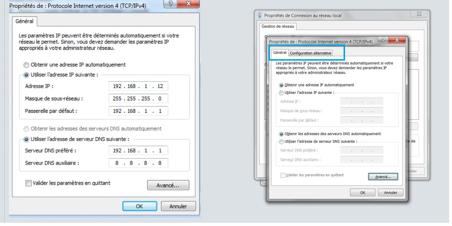 --> Protocole Internet version 4 (perso je decoche l'ipv6 mais ce n'est pas obligatoire) --> propriété -->