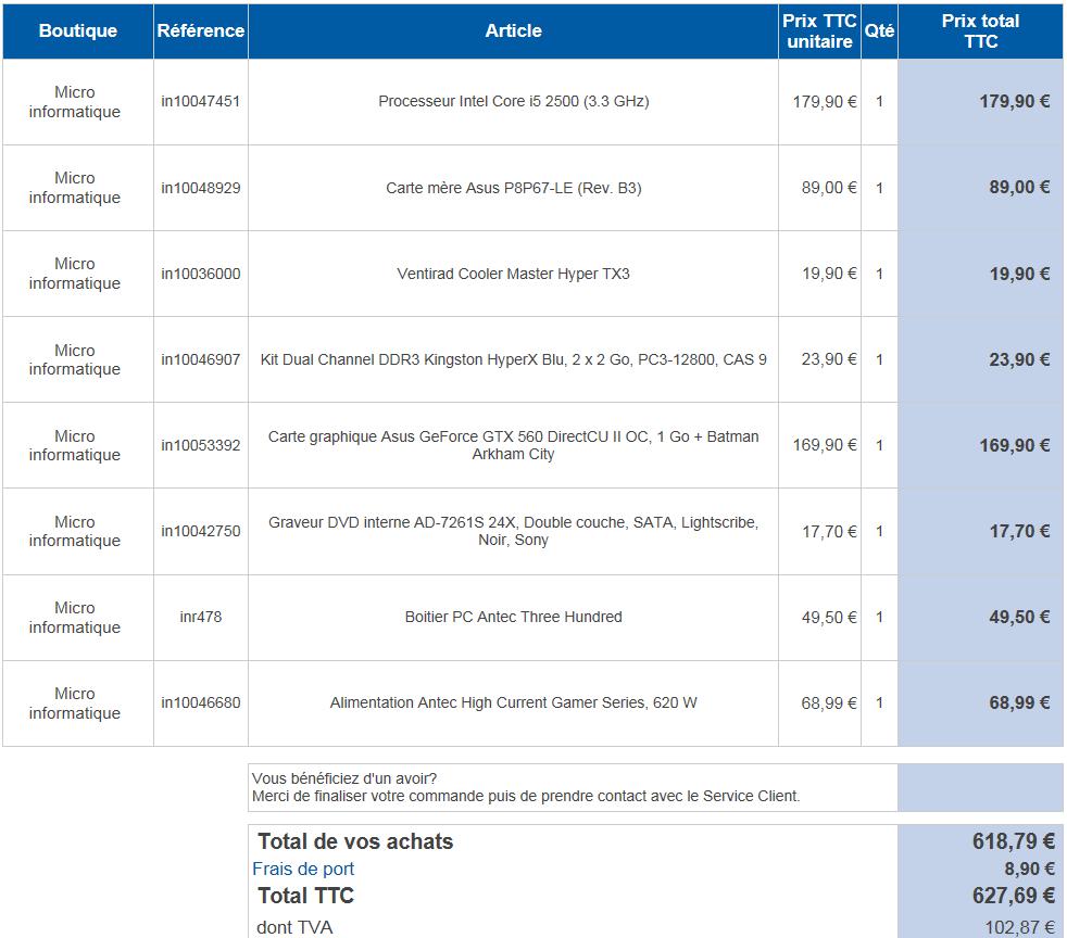 Avec tout ça, le total s'élève à un peu moins de 570 euros...auxquel tu peux ajouter environ 60 euros pour une Antec HCG 520 watts, on atteint 630 euros.