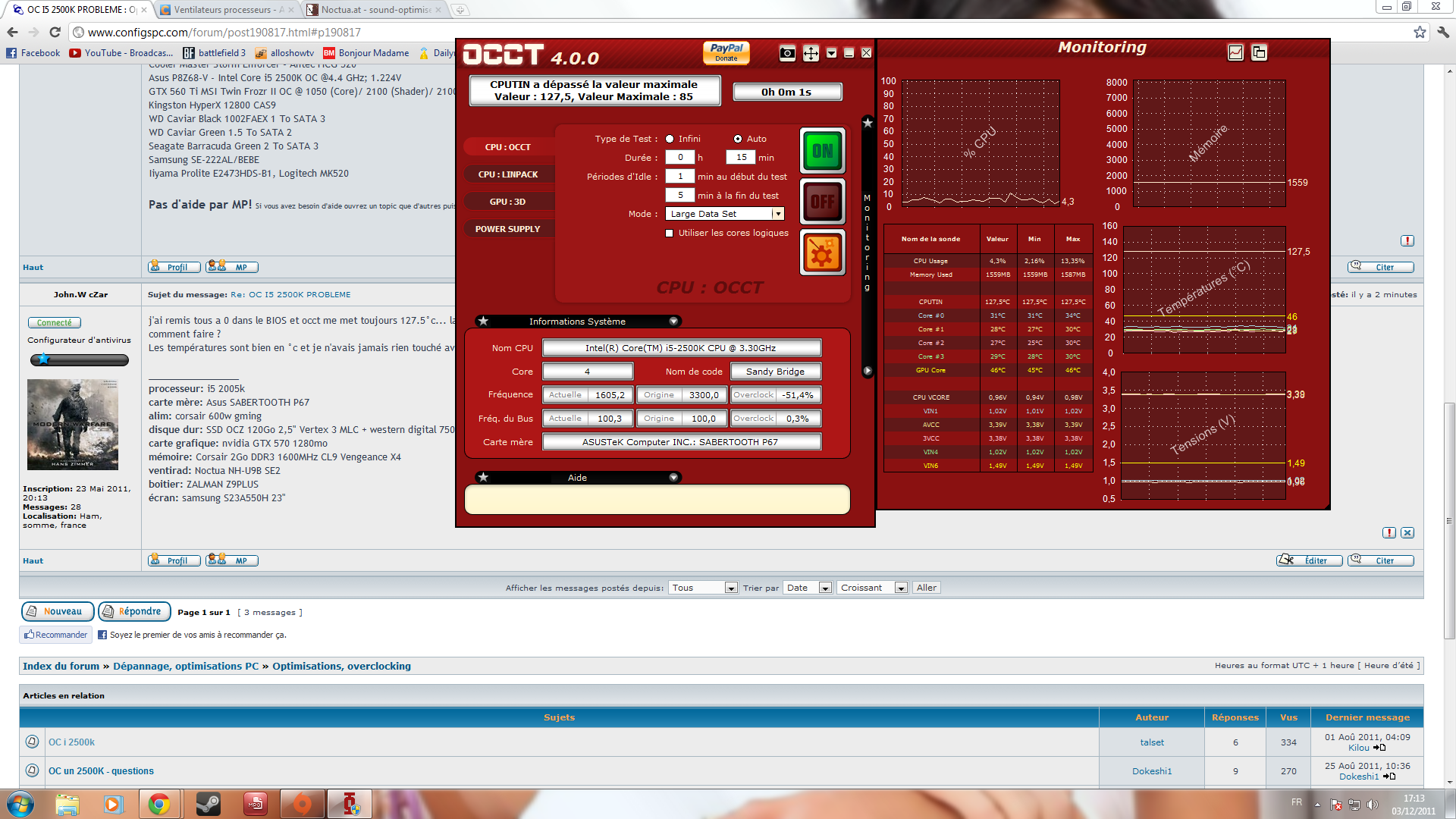 j'ai voulu OC mon processeur i5 2500k, mais problème lors du test sous occt même avant de commencer le test mon "CPUTIN" est a 127.5°c.