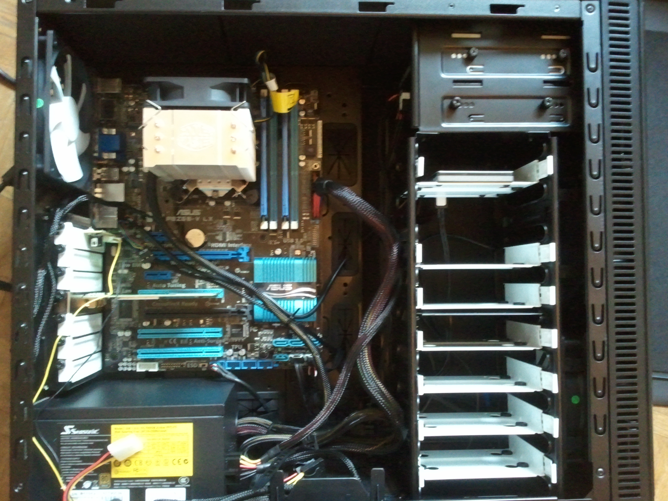 Pas mal pr un 1er montage :) tu px (si tu as la motiv' :P ) faire passer les cable d'alim deriere le panneau latèral. Conseil vu que la place est réduite, couche le boitier si tu vois que tu galère a refermer (m'enfin comme tu n'as pas de Cg ca devrait aller tout seul ;) )