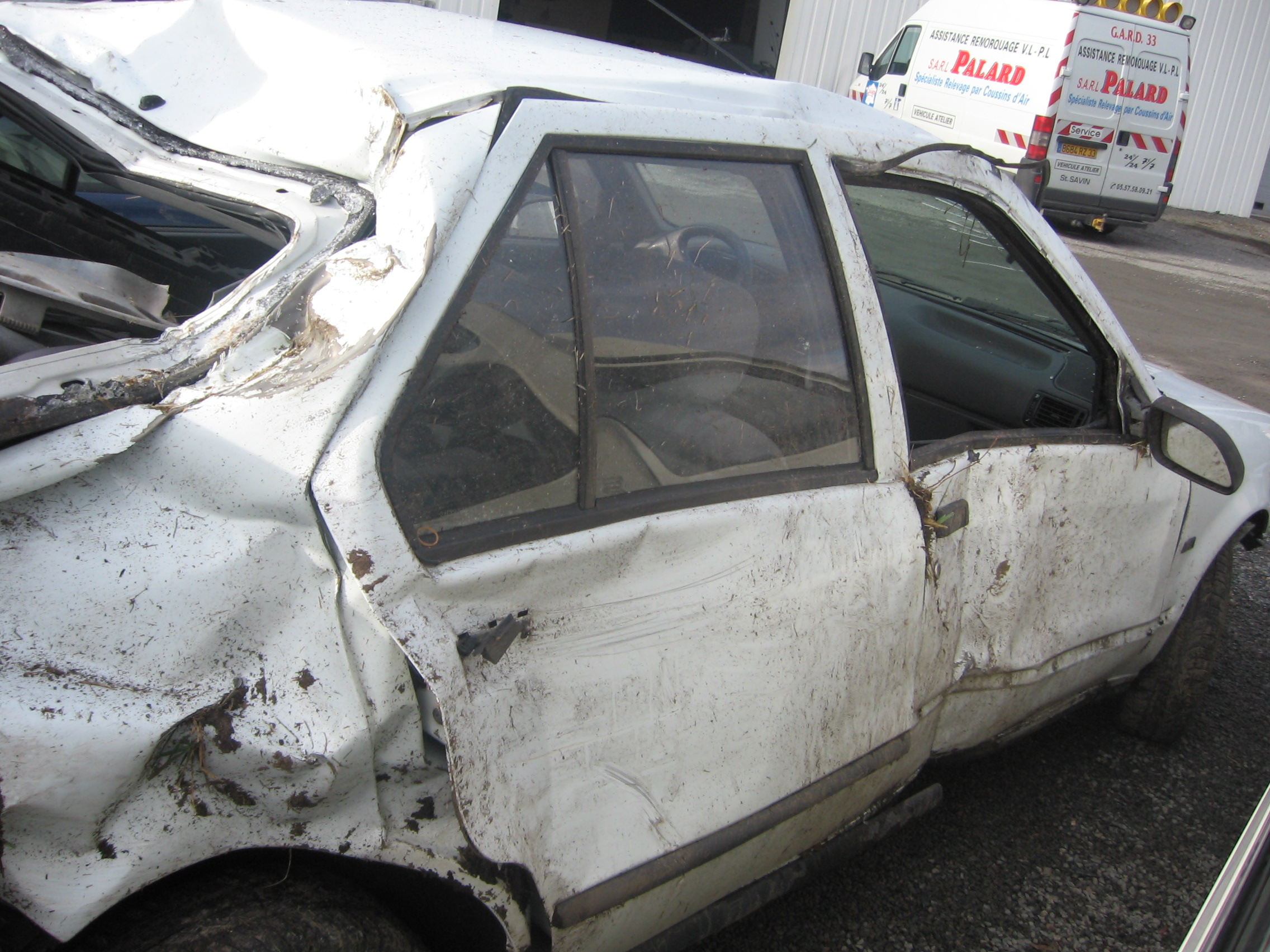 Voici donc ma première voiture ou se qu'il en reste suite au verglas dans un virage à 5 min de chez moi . j'ai essayer de rattraper l'histoire mais sa a finis dans le fossé et retour sur la route . j'ai taper un poteau ptt au passage qui s'est completement incruster dans le coffre.