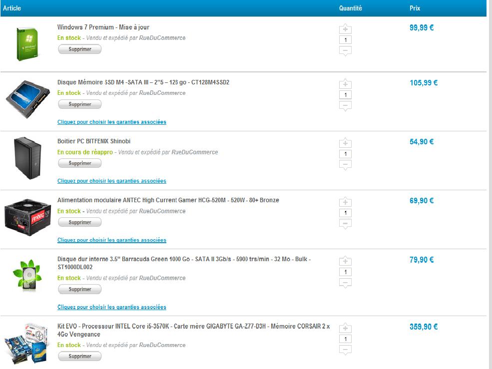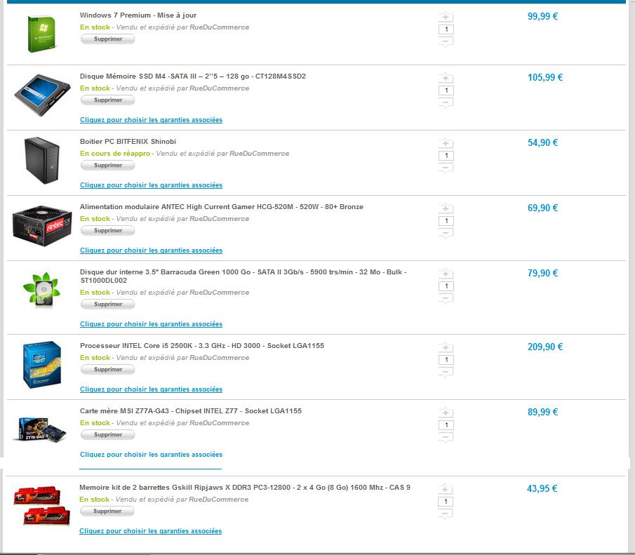 J'ai commandé ce matin seulement chez top achat. J'ai remplacé le boitié par le fractal r4 plus cher mais le design et les commentaires m'ont convaincu. J'ai également craquer a la dernière minutes pour la z77g45 et le ventirad macho plus changer la ram gskill par la kingston hyperX. Le topic sur l'oc m'a vraiment donné envie par contre je dois encore investir dans un écran et une carte graphique.