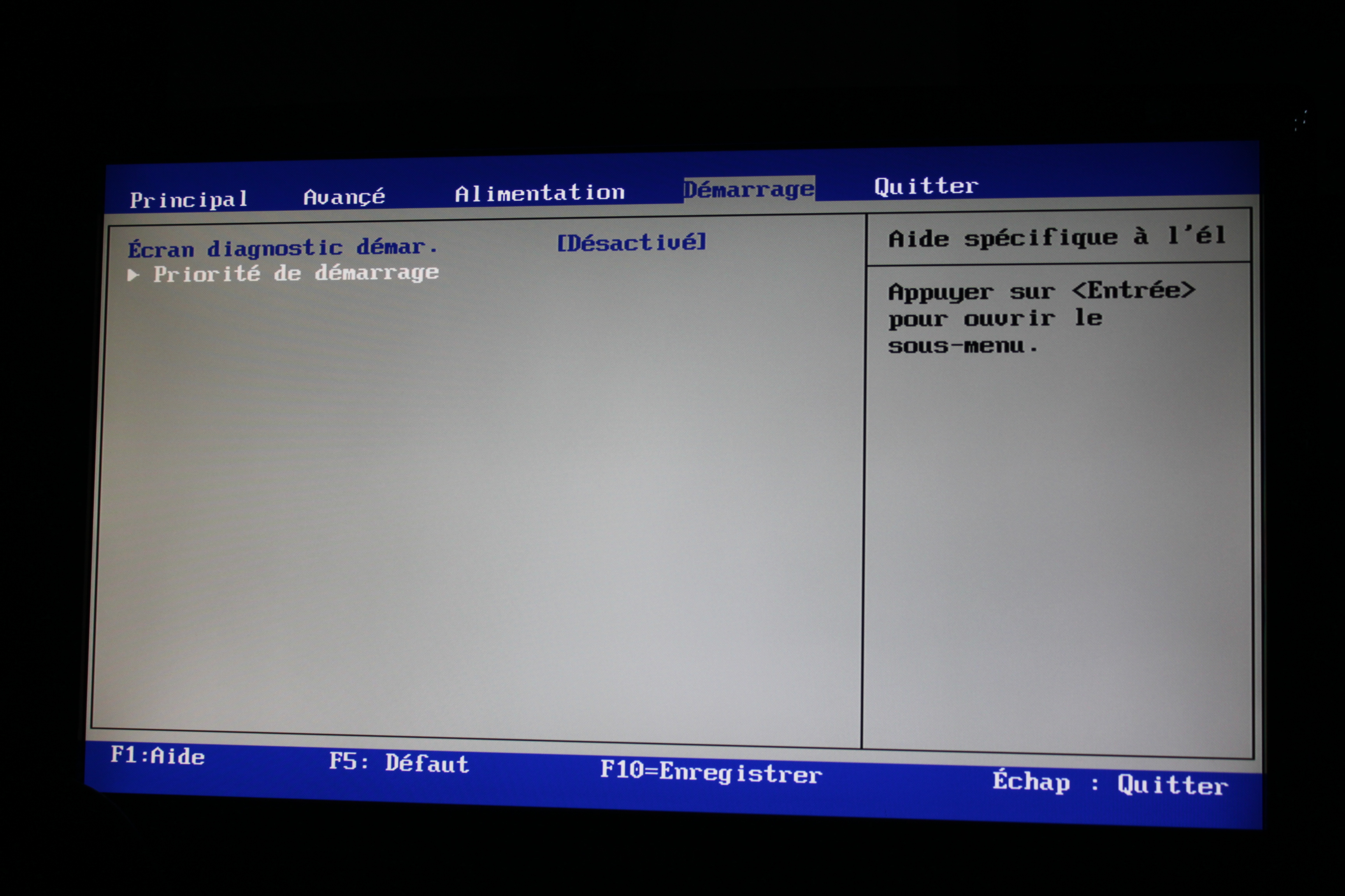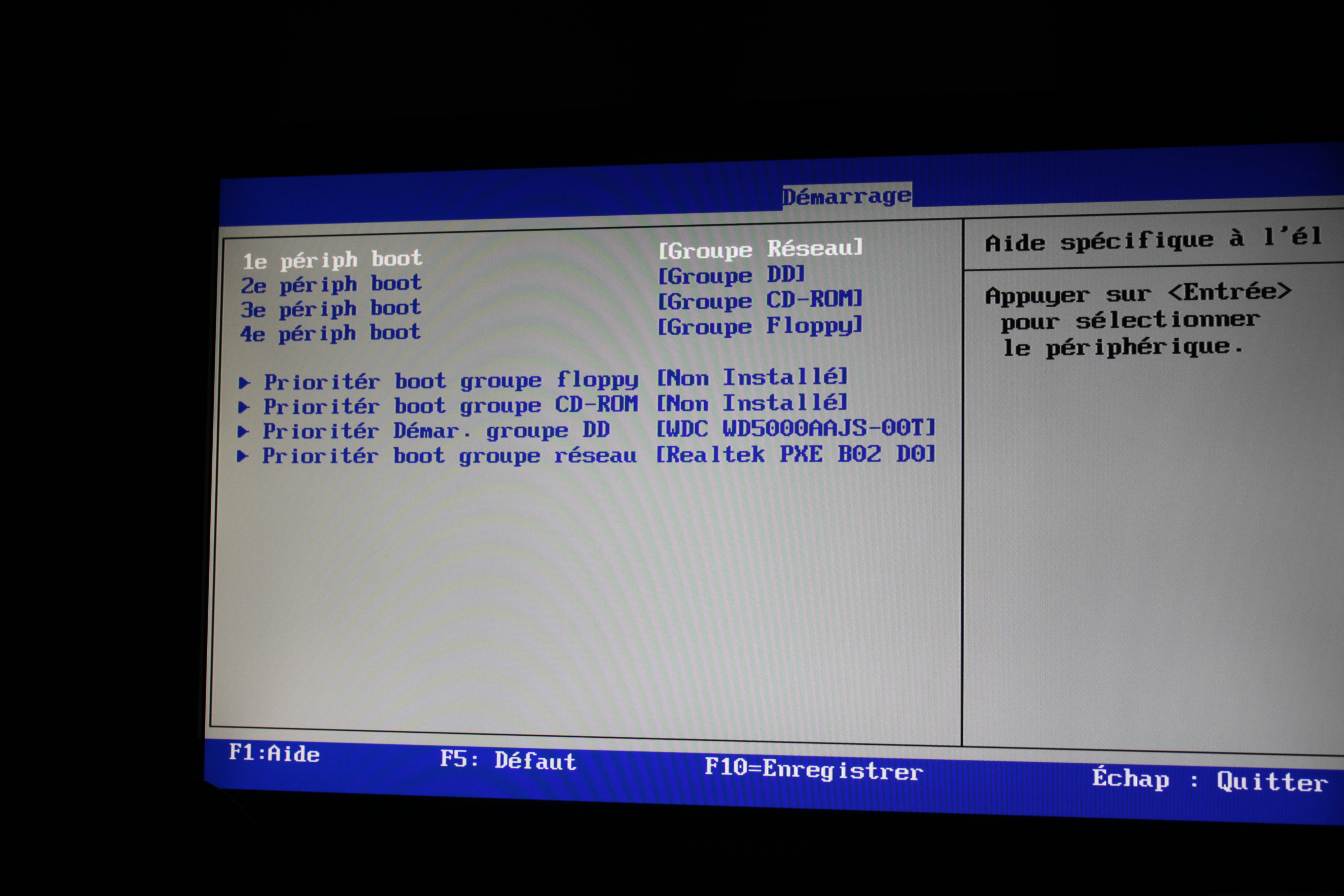 Le soucis étant que je ne pige quedal au Bios ; dans l'onglet Démarrage//Priorité de démarrage; j'ai le choix entre le groupe floppy, le groupe CD-Rom, le groupe DD et le groupe réseau :