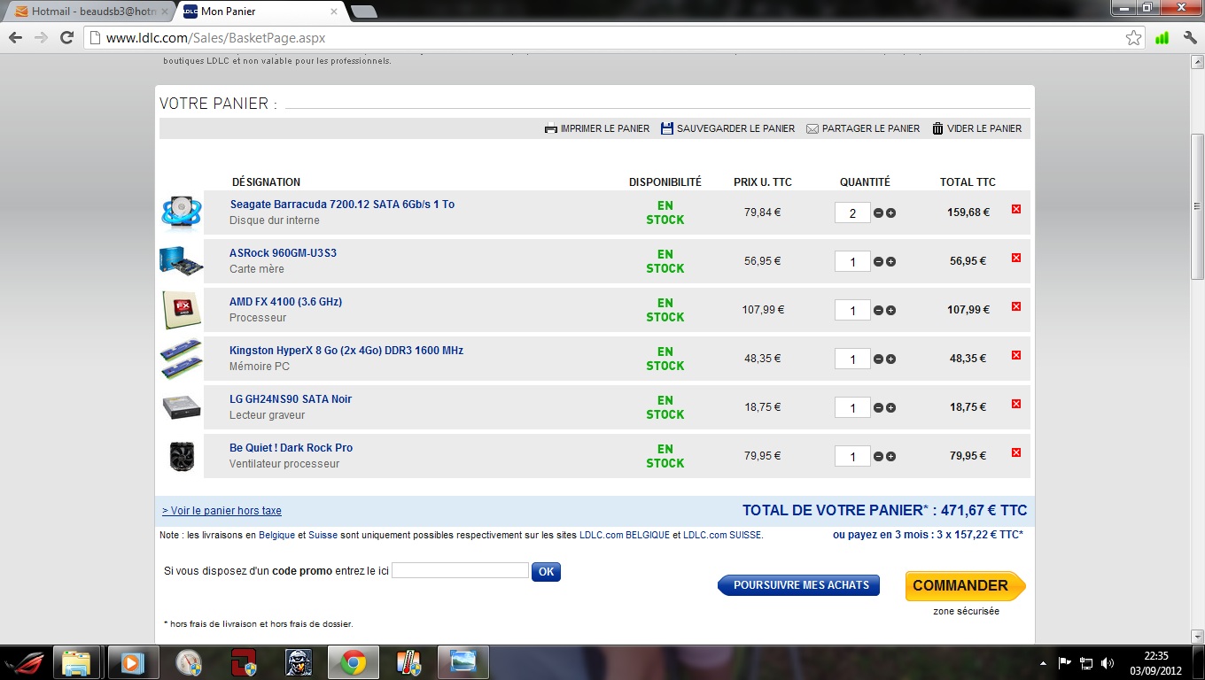 je t'ai mis un screen du panier, ce a quoi il faut ajouter mon xpredator et mon alim ocz mkIII 500W.