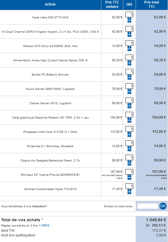 Par contre pour l'écran c'est un compromis de prix (J'ai mis le moins cher ^^) iiyama est au top, je sait mais bon si en contrepartie je doit réduire ailleurs...
