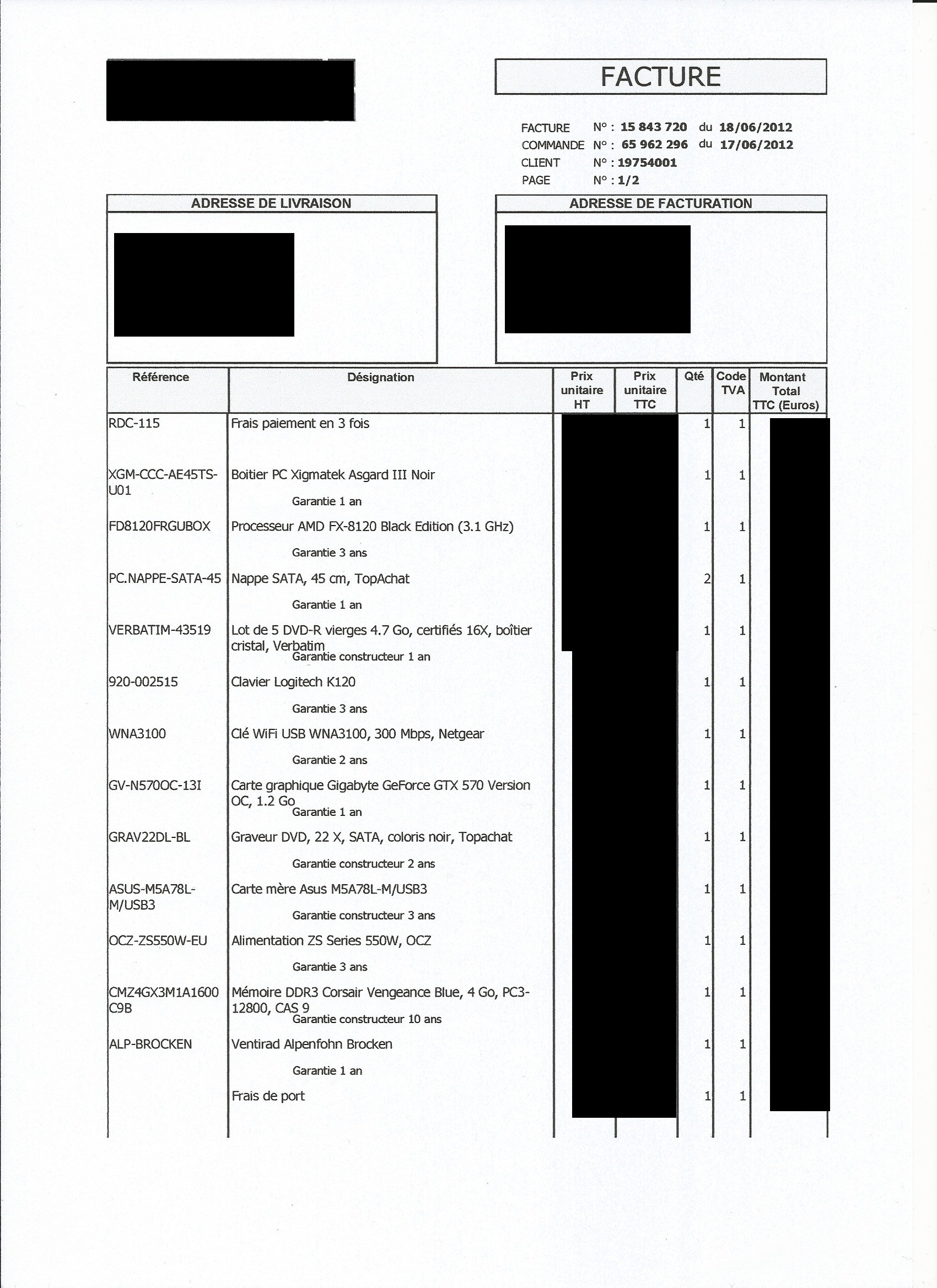 Je vends un PC assemblé en juin 2012 dont la configuration est la suivante :