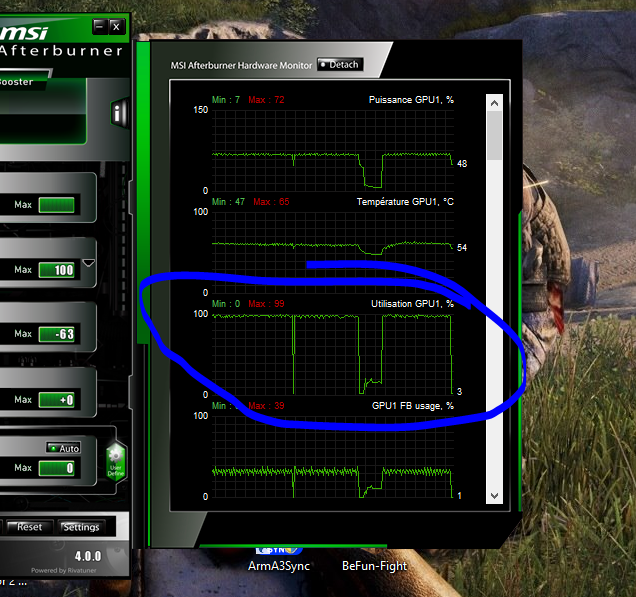 J'ai un problème avec ma carte graphique je me suis rendu comte d'une choses ma CG est à 100% alors que je suis sur le bureau et un simple mouvement de souris ou de clic la refait redescendre et remonte ensuite , cela me cause des stuttering en jeux avec des mini TP , alors que j'ai 60 fps j'ai l'impression de buggé exemble : call of duty je tourne a 180-200 fps d'un seul coup grosse descente de framerate à 80 et j'ai l'imprésion de faire du 20 avec des mini téléportation , après cela s'atténue et recommence et dans certain jeux ou je n'est pas énormément d'fps cela est très chiant !