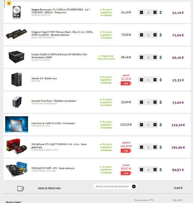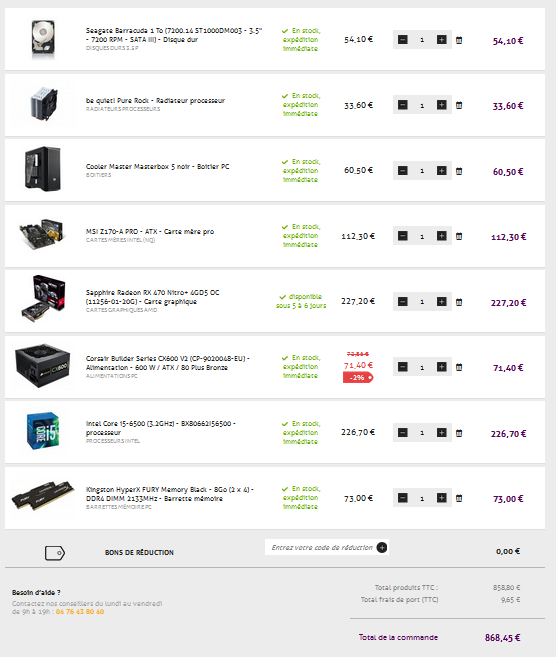 Après tu peux encore gratter en cherchant des codes promos et/ou en achetant sur plusieurs sites si tu fais le montage, par exemple certains composants sont moins chers sur Amazon et y'a pas de frais de port. Le processeur par exemple : https://www.amazon.fr/Intel-Skylake-Pro ... B010T6CWI2