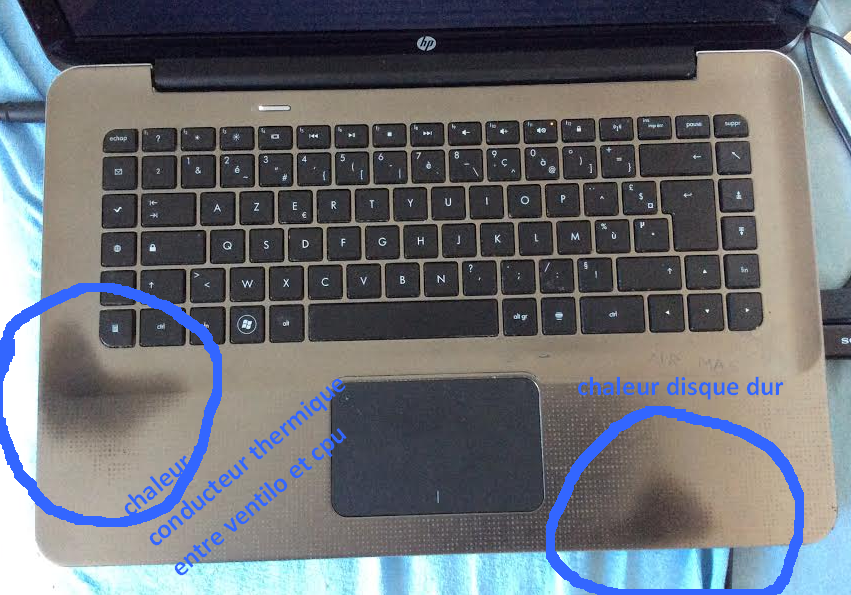 ce qui me dérange surtout c'est la chaleur, comme vous pouvez le voir ci-dessous elle a carrément laissé des traces sur le repose coude, elle a fait gonflé la batterie (qui est HS) et c'est pas trop supportable ! (sans compter la chaleur ces temps ci