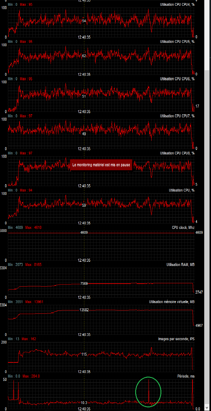 En observant les données de MSI afterburner le graphique de "frametime" montre un pic de latence, puis des baisses de fps très brèves (environ entre -2 -4 fps ) qui ne durent même pas une demi-seconde et ce malgré même des fps plus que corrects...