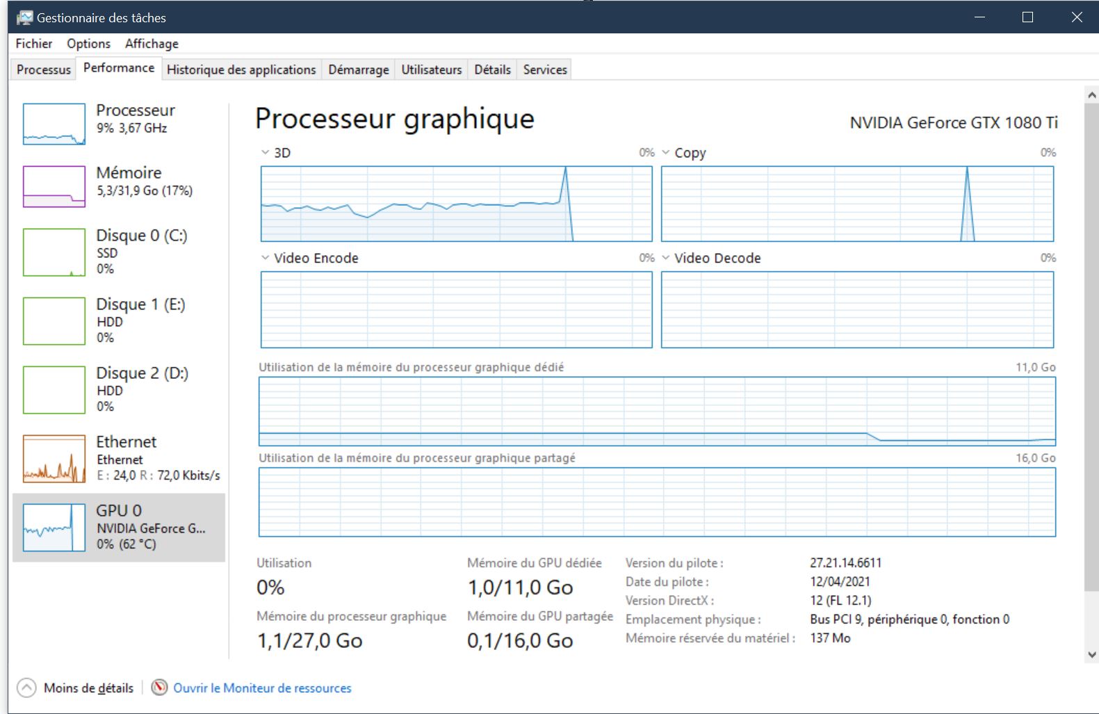 Je viens vers vous car j'ai un problèmes , ces que depuis 19h~ j'ai des crash quand je joue a des jeux ( Rocket League le jeu se ferme entièrement et instantanément , et sur TFT le jeu freeze puis se ferme ) j'ai remarqué sur Rocket League qu'au moment du crash , ma carte graphique ( 1080 TI ) fait un pique dans le gestionnaire de tache