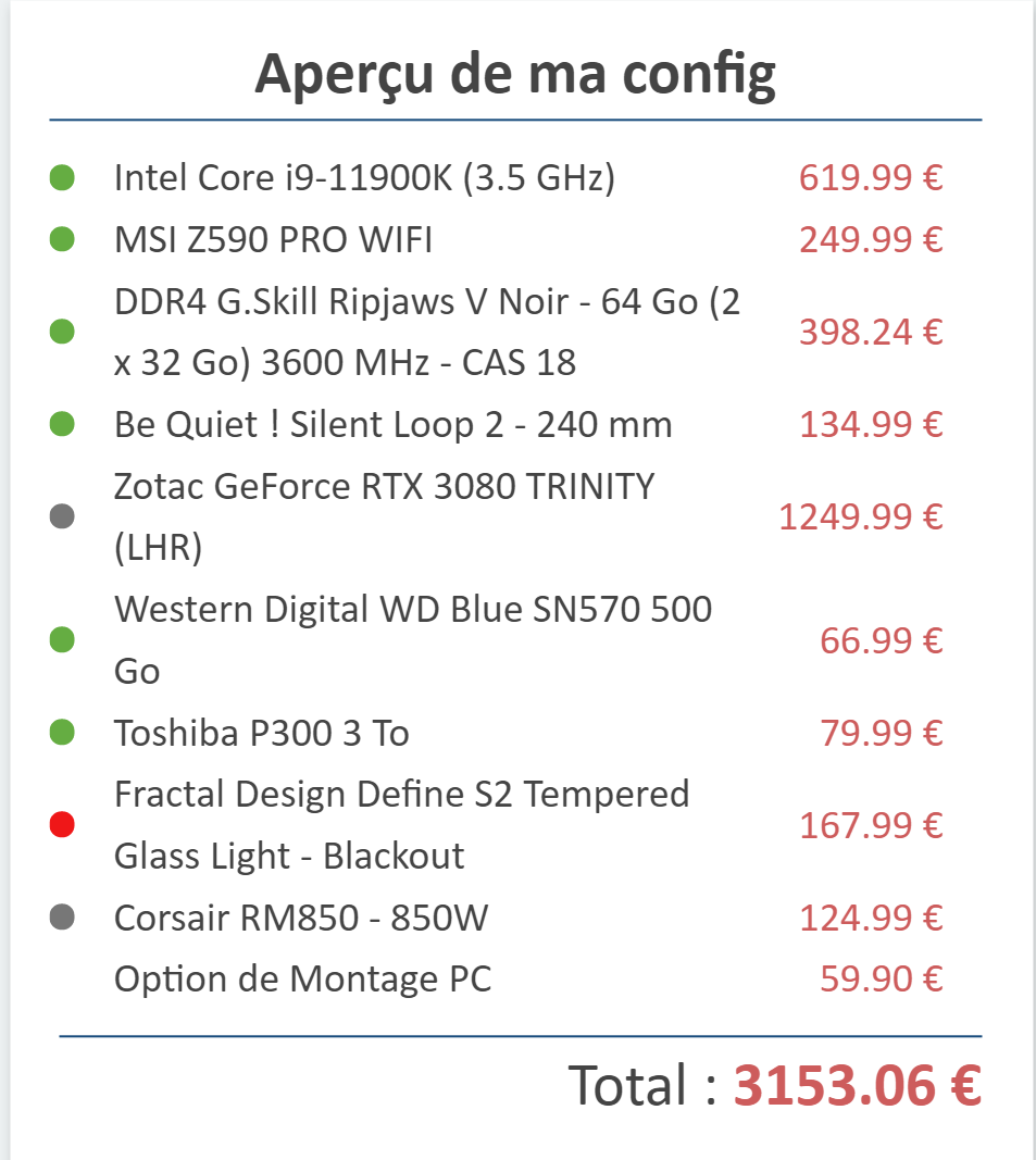 J'hésite un peu sur le CPU n'ayant pas suivi l'actualité la plus récente. Intel semble moins cher à puissance égale sur ce segment