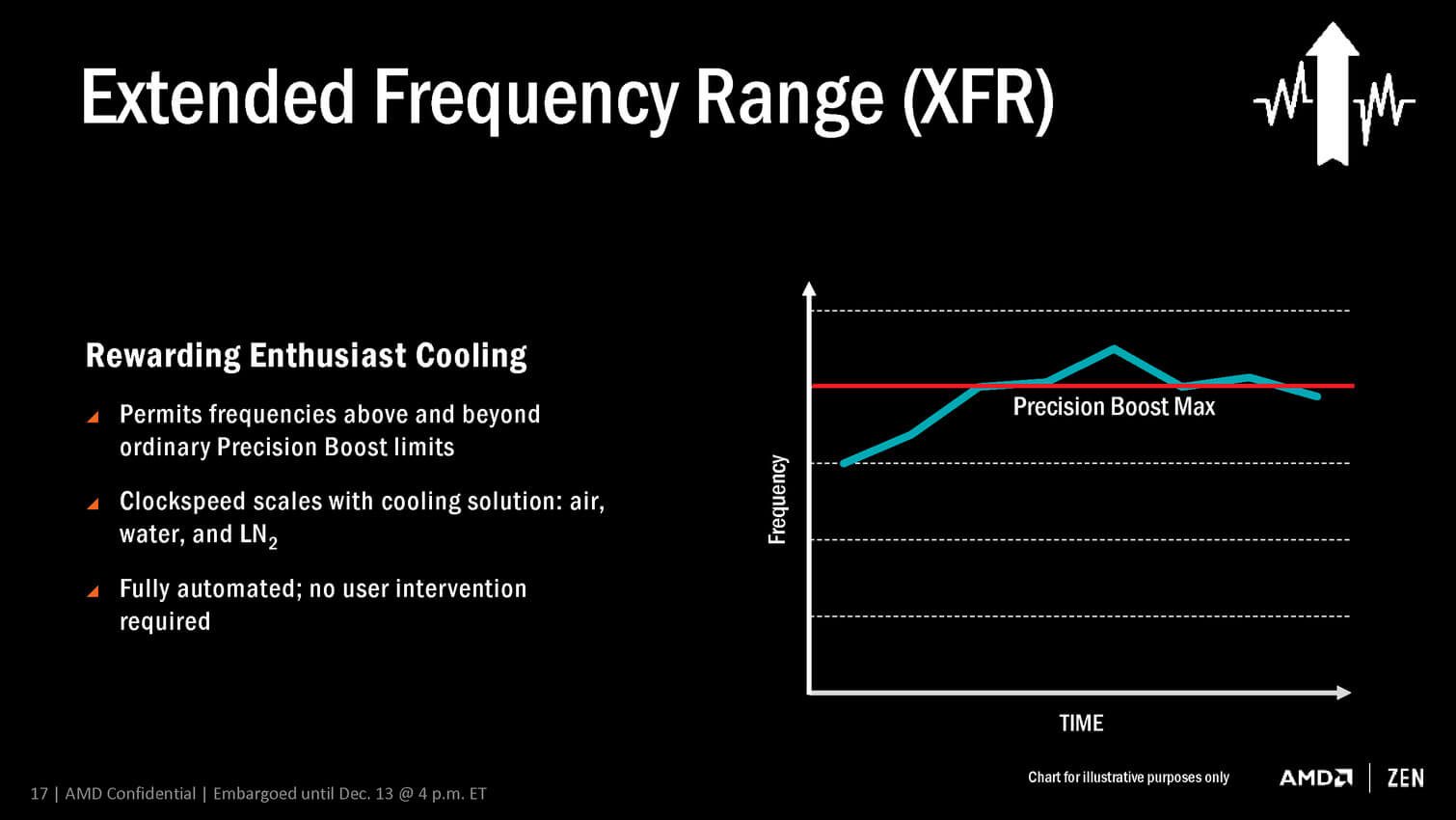 Extended Frequence Range (XFR) est en quelque sorte un outil intégré d’overclocking automatique qui permet de dépasser la fréquence turbo d’un processeur Ryzen. Cette fréquence maximale sera calculée automatiquement en fonction du refroidissement utilisé (overclocking léger avec un gros ventirad, plus important avec un watercooling et maximum avec de l’azote liquide).