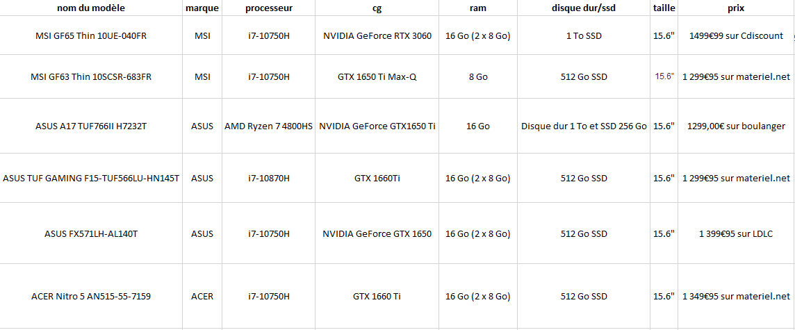 EDIT : Après quelque recherches j'ai trouvé quelque pc qui pourraient m'intéresser et j'ai fait un tableau afin de les comparer... Des avis ? Les liens (dans l'ordre)