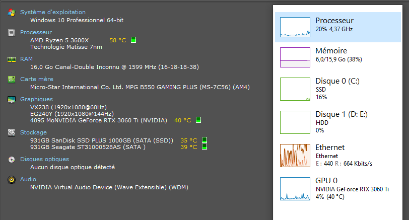 En gestionnaire de tâche et Speccy, j'ai :