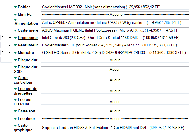 Je tente donc de mettre au point une config moi même, même si j'ai quelque notion en informatique je n'ai pas le monopole de la connaissance c'est pourquoi je me tourne vers vous pour que vous me donniez vos avis, et éventuellement des substitut si les choix que j'ai effectue peuvent être améliorer.
