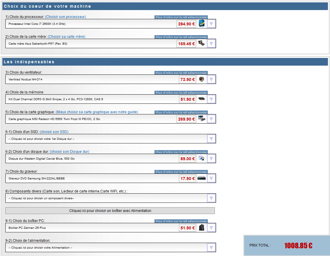 j'ai re revu la config car sur cdiscount encore moin cher mai j'ai mit avec topachat parceque l'on voit tout c'est le meme produit sur cdiscount pour 950€ avec livraison gratuite et le ddr est 1to 32 7200tr au meme prix mai je penseque la config est mieux !!! je depasse un peu mai mon pere va comprendre !! et avec cdiscount bf3 gratuit et 1 abonement a un magasine cher pas quoi