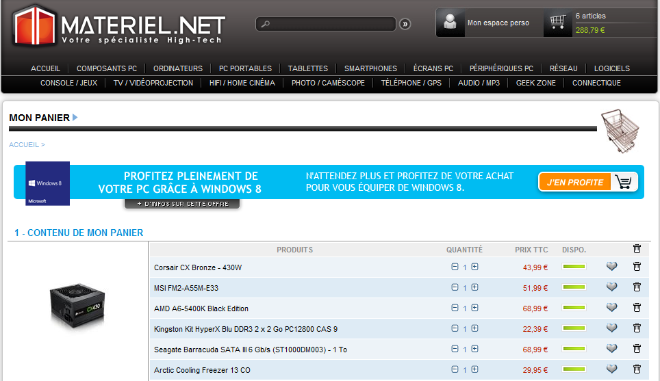 - Alimentation : Corsair CX Bronze 430 Watts 39.90 €