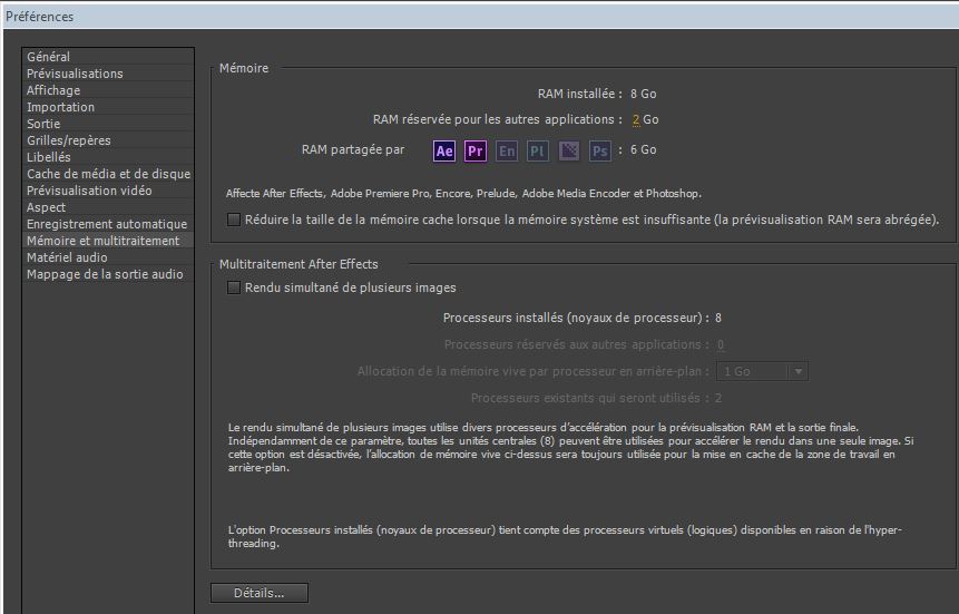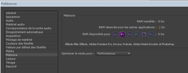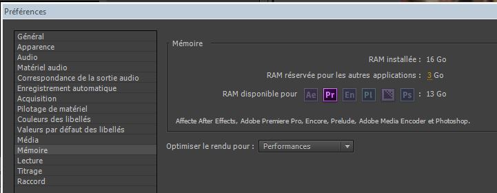 Pour vous dire que je viens d'ajouter 8 Go de RAM (ce qui me fait 16 Go) et je me rends compte que Premiere Pro est plus fluide. Je pense qu'il y a une nette amélioration. Je joins les captures d'écran et j'aimerais savoir si le réglage des préférences est correct ou non. En vous remerciant encore pour l'aide.