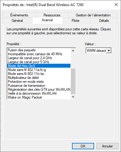 Sachant qu'il y a des paramètres de ma carte Wi-Fi/Bluetooth que je peux modifier en allant dans le Gestionnaire de périphérique (j'ai une carte Wi-Fi Intel Dual Band Wireless AC-7260).