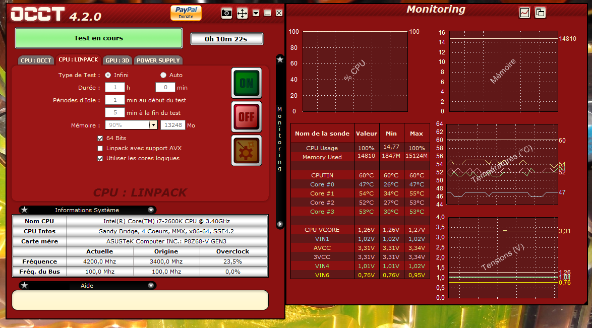 j'ai enfin pu retoucher au 2600k et après avoir démonter et remonter mon waterblock j'obtient ces t° à 4.2ghz et 1.27v :