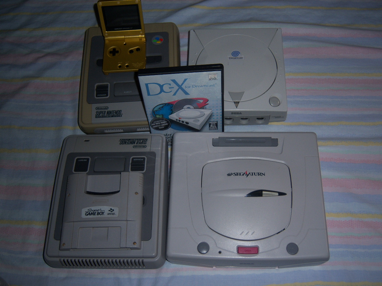 une GBA SP au couleur de Zelda + une Dreamcast avec adaptateur pour jeux import + une Saturn jap modifiée 50/60 hertz + 2 SNES dont une modifiée 50/60 hertz ( la grise )